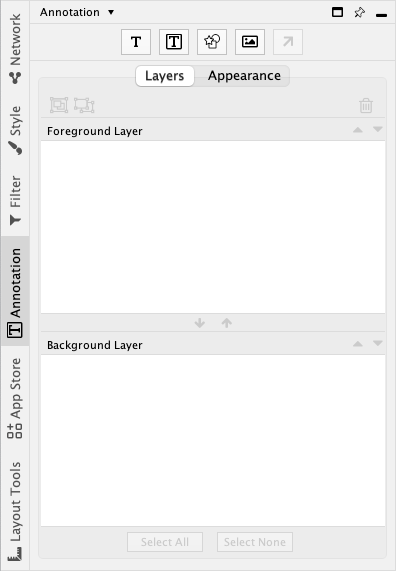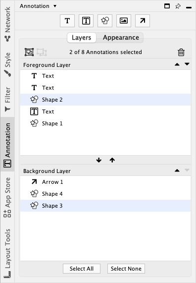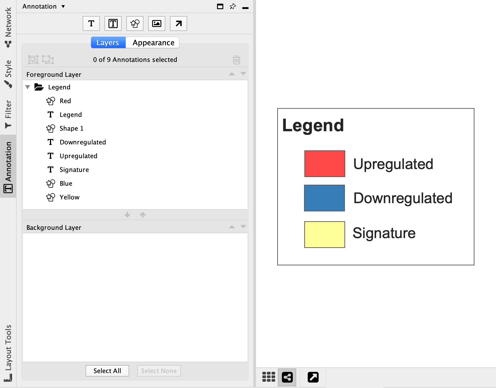要修改注释的属性(例如:颜色,文本),在 Annotation 面板中或网络中选择注释,之后单击 Appearance 选项卡。或者,右键单击网络中的注释并选择 Modify Annotation...。