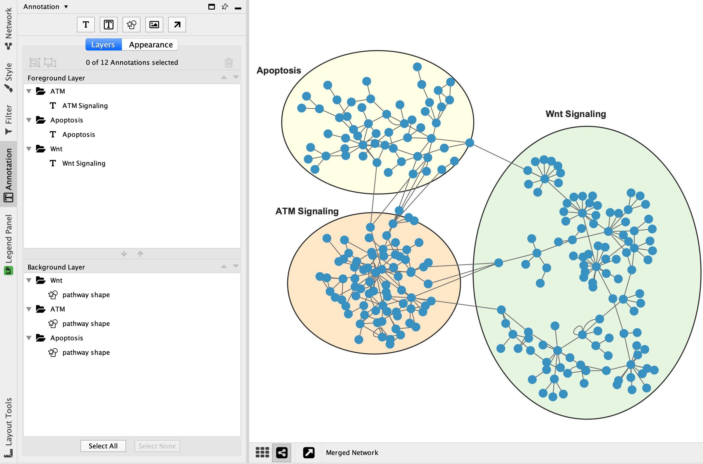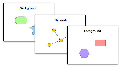 中间的网络层包含节点、边和图表,前景和背景层包含注释。