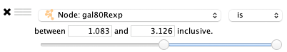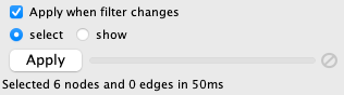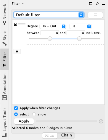 根据过滤器的性质,Cytoscape 可以将他们高效且交互地应用于网络。某些过滤器提供滑块控件可以快速浏览不同的阈值。这在较小的网络上是默认开启的,对于大型网络,Cytoscape 会自动禁用此交互特性。通过选择 Apply when filter changes 复选框可以手动开启此设置。