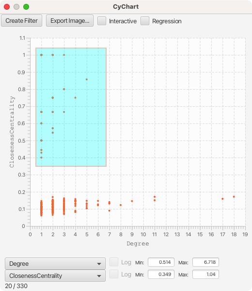 与直方图一样,散点图也包含一个复选框用于设置是否在鼠标移动时或仅在释放时更改网络中的节点选择。如果拖动选择矩形时出现闪烁,则应该关闭 Interactive 模式。