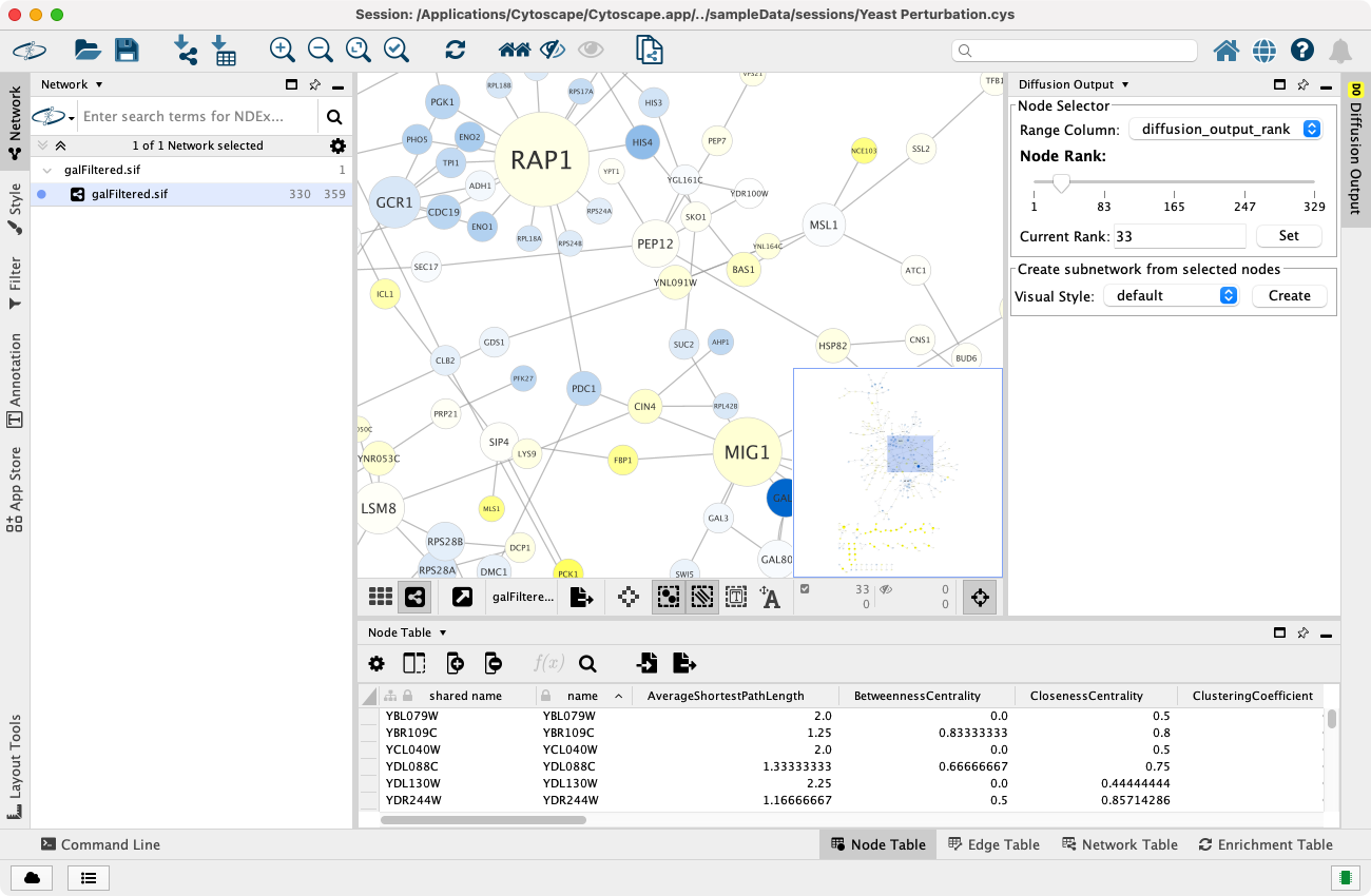 要选择 33 个以上的节点,可以向右移动 Diffuse Output 面板中的 Node Rank 滑块,或在 Current Rank 中输入大于 33 的数字。你还可以通过使用 Range Column 选择包含热量值的列指定选择节点的数值范围。最后,通过 Visual Style 选择器和 Create 按钮将所选的节点提取到新的网络中。