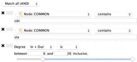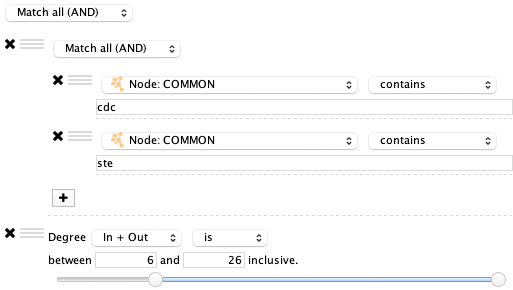 默认情况下,节点和边需要满足所有过滤器的约束。你可以改变这个设置,从而匹配的节点和边只需要满足至少一个过滤器的约束条件。通过 Match all (AND) / Match any (OR) 下拉框可以对其进行控制。当过滤器中包含多个子过滤器时,下拉框会自动显示。例如:假设你想匹配 COMMON 列包含 ste 和 cdc,同时只希望度为 5 或更大的节点,你需要构建如下所示的过滤器: