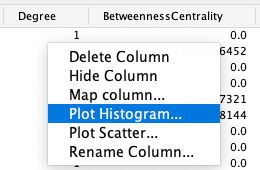 使用 cyChart 创建直方图,右键单击节点或边表格中数值类型数据列的标题,然后选择 Plot Histogram...。Tools 菜单也提供了 CyChart 选项。