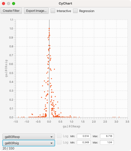 cyChart 作为 Cytoscape 的核心应用是一个绘图包。cyChart 提供了利用节点和边数据的简单一维和二维绘图功能。在图表中进行选择将会相应地选择网络中的节点和边。这提供了另一种在 Cytoscape 中可视化数据并与之交互的方法。