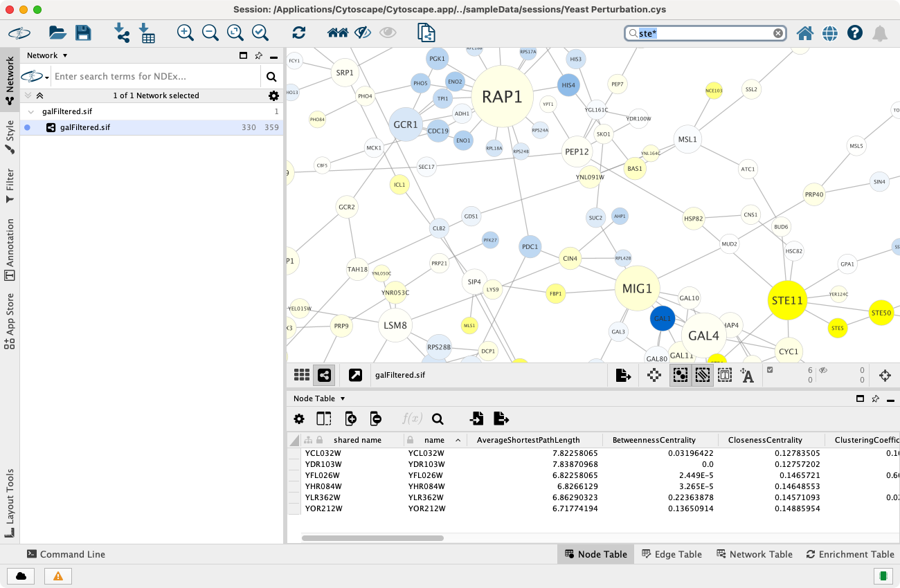 你可以直接在工具栏的搜索框通过列值搜索节点和边,然后单击表格面板中的 Search Table 按钮来查找节点和边表格。例如,要选择以 STE 开头的列值的节点或边,可以在搜索栏中输入 ste*。搜索不区分大小写,* 为零个或多个字符匹配的通配符,? 表示完全匹配一个字符。因此 ste? 将会匹配 STE2 而不会匹配 STE12,而 ste* 则会两者都匹配。