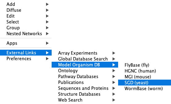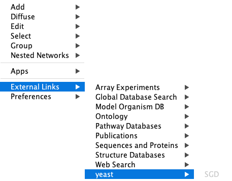 将 SGD 链接放在 Model Ogranism DB 子菜单下。该链接在 Cytoscape 中显示为: