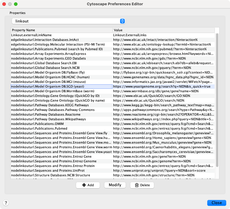 默认链接定义在 CytoscapeConfiguration 目录中的 linkout.props 文件中。这些链接是常规的 Java 参数,可以直接通过文本编辑器或 Cytoscape 配置编辑器(Edit -> Preferences -> Properties...)并选择 linkout 进行编辑(如下图所示)。