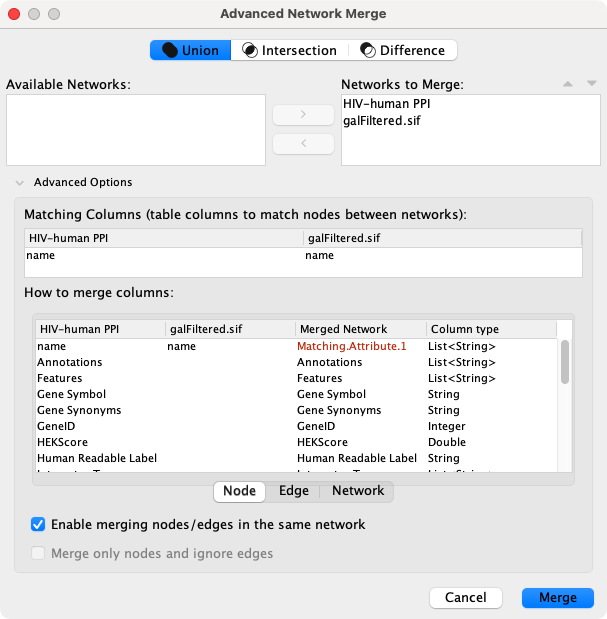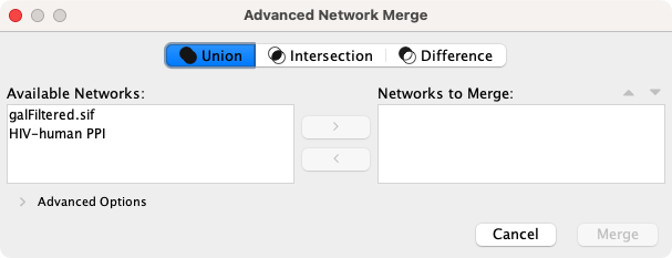 通过 Tool -> Merge -> Networks... 打开 Advanced Network Merge 界面合并两个或多个网络。
