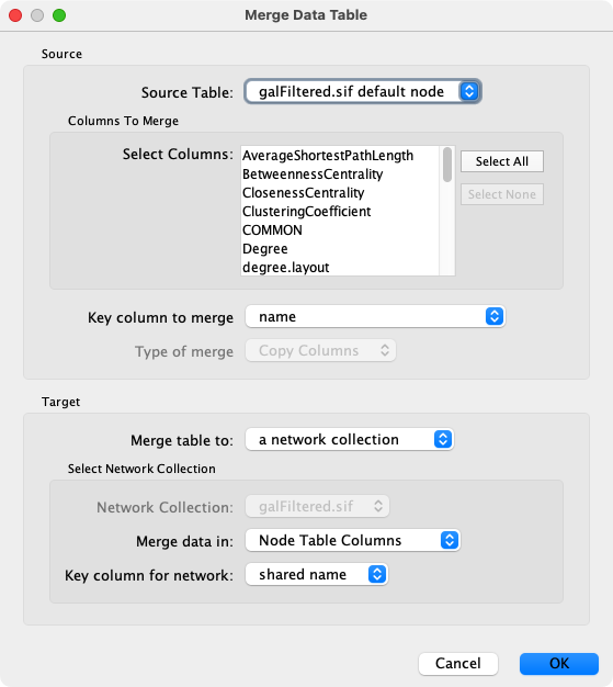 节点和边的合并与网络合并的方式类似,可以在网络集内部或网络集之间合并表格。