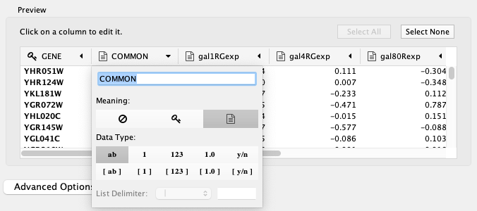 数据表文件包含一个主键列和至少一个数据列。数据列的数量是无限制的。Alias 列是一个可选项,使用数据的第一行作为列名也是如此。或者你可以通过 File -> Import -> Table from File... 指定每个列的名称。