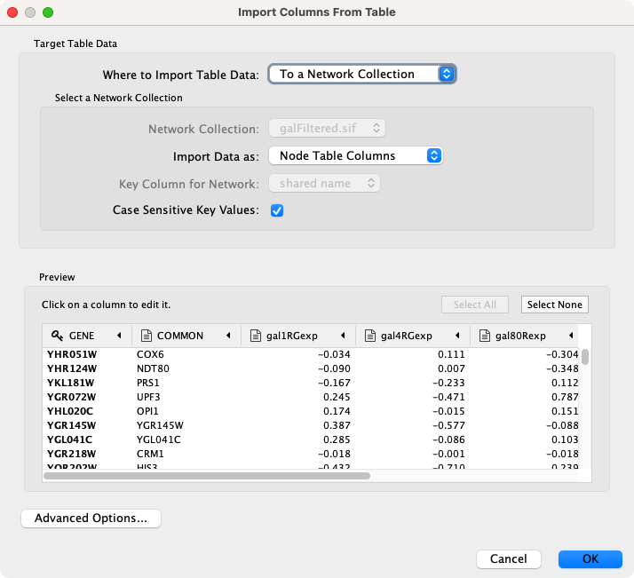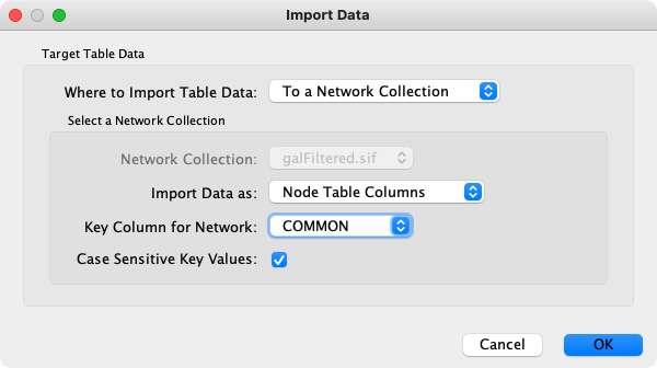 Key Column in Cytoscape选择COMMON,对于Data Type选择Gene Names(s)。