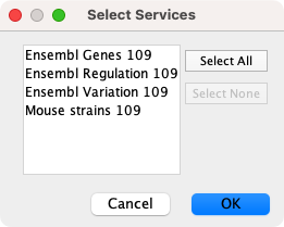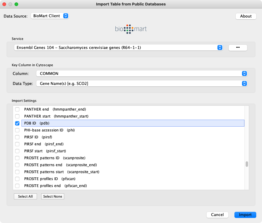 Import Data Table from Public Database对话框中,选择一个服务。由于 galFiltered 网络来自 yeast,因此选择Ensembl Genes - Saccharomyces cerevisiae genes。 - 对于