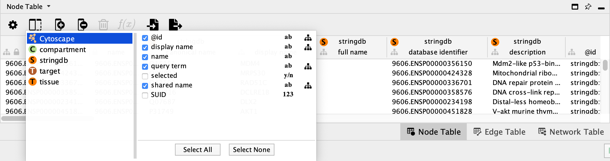 通过右键单击列标题并选择 Rename Column... 可以重命名表格面板中的列。表格面板支持命名空间,因此如果有几列包含相关信息,可以为其创建一个命名空间。命名空间和列名之间由双引号 :: 分隔。例如,如果数据的多个列包含 compartment 信息,可以以 compartment::cytosol,compartment::endosome 等格式编辑列标题为其创建具有多个关联列的命名空间。之后可以对命名空间的所有列上进行显示/隐藏之类的操作。