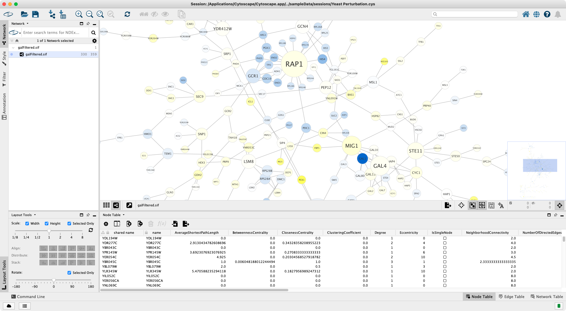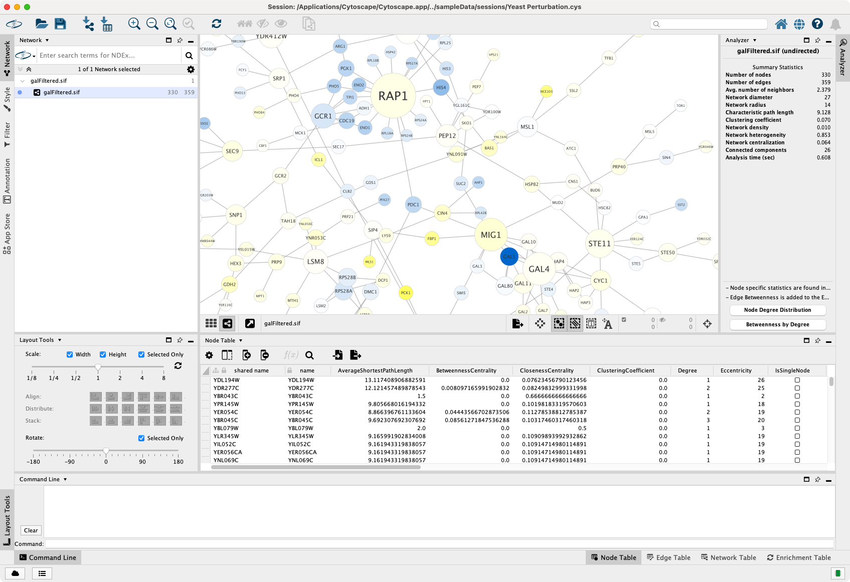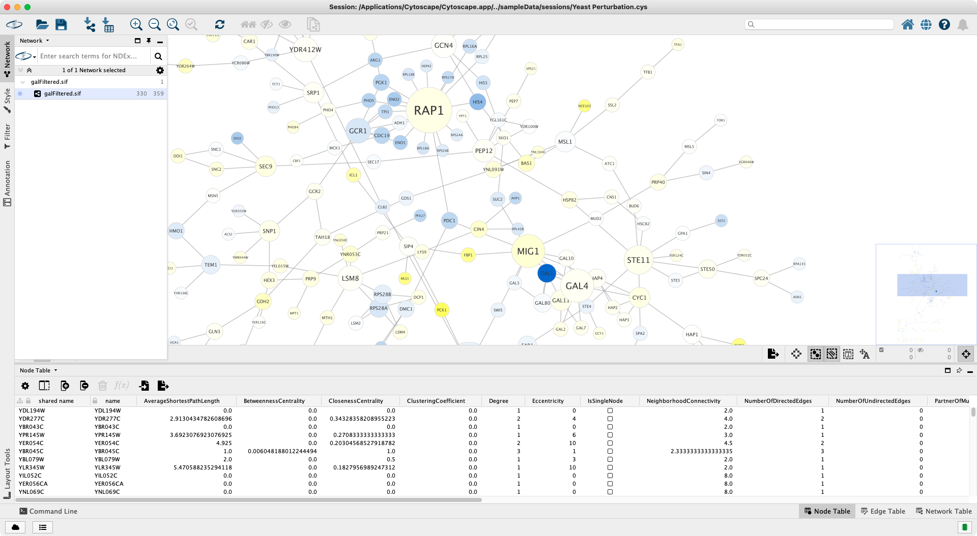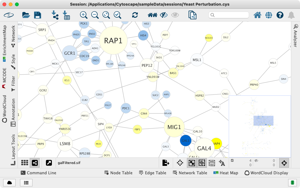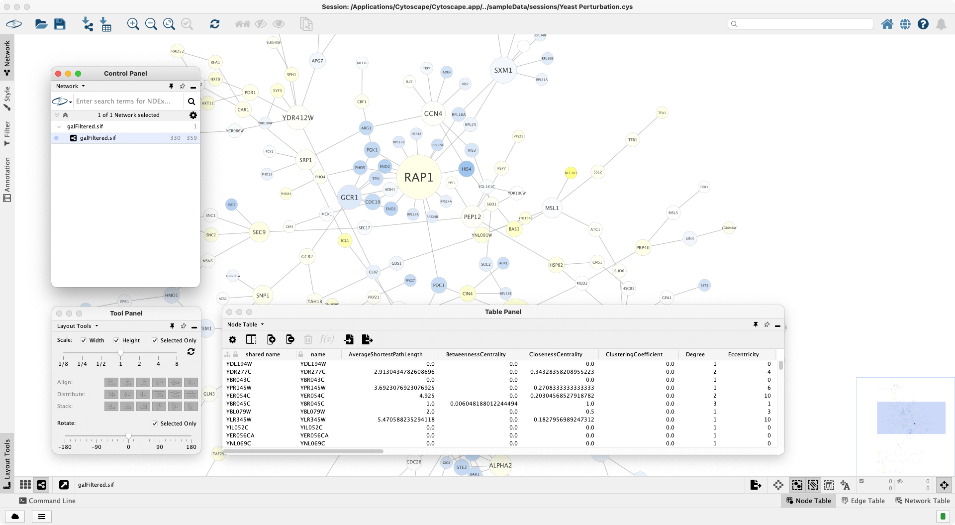 每个面板包含多个选项卡。例如,控制面板至少包含 Network,Style,Filter 和 Annotation 选项卡。表格面板包含 Node Table,Edge Table、Network Table 和 Enrichment Table 选项卡。Node Table 和 Edge Table 包含所有与节点和边有关的数据。Network Table 包含网络维度的关联数据,例如 URL 或发布链接。可以通过在 Network Table 中添加列来讲相关的网络维度的信息添加到网络中。Network Analyzer(Tools -> Analyze Network)的分析结果显示在结果面板中。已安装的应用可能会添加到其他选项卡中。