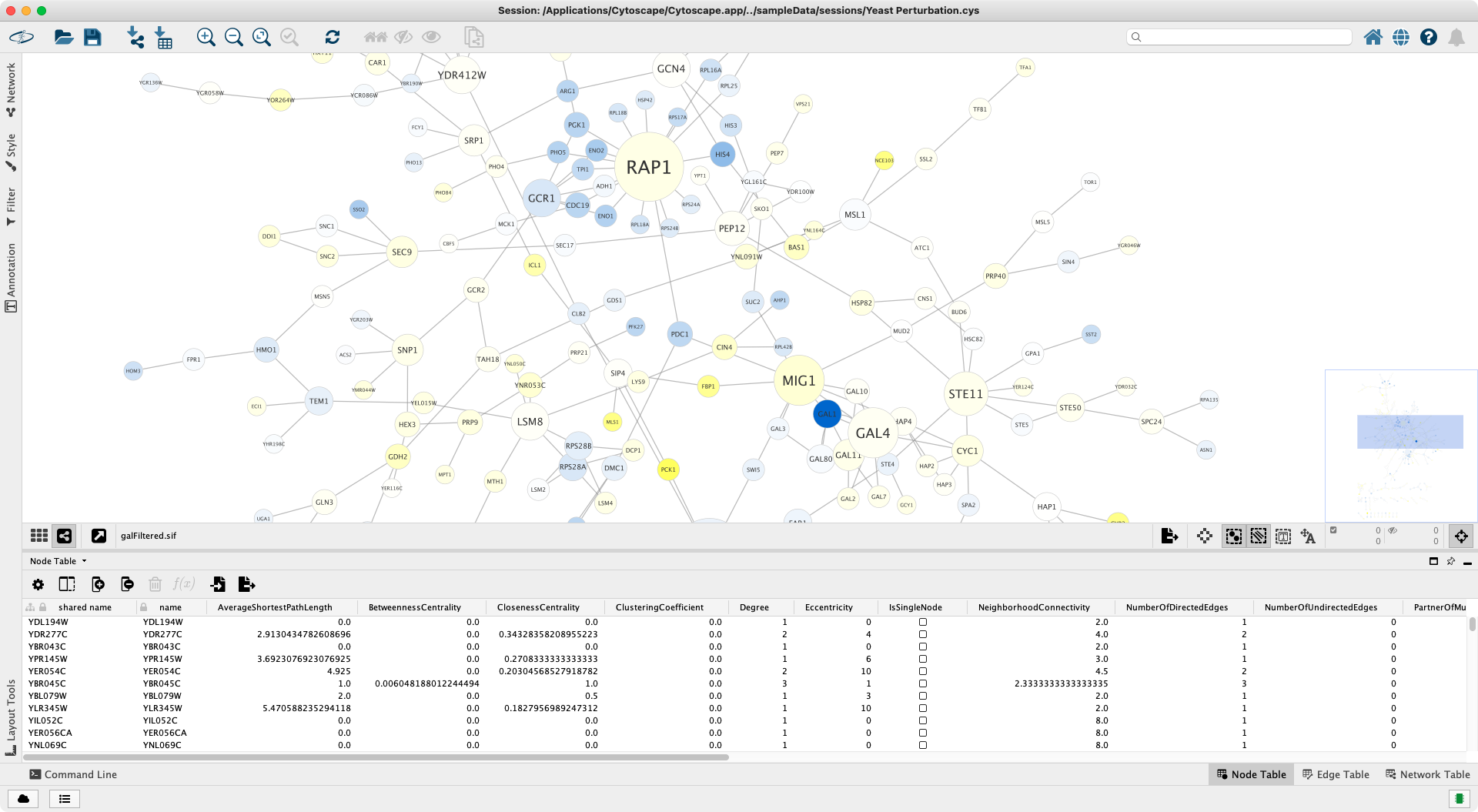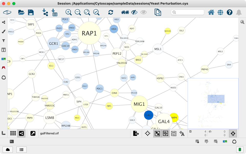 将面板取消停靠或单击侧边栏上的一个选项卡来显示最小化的面板。在这种状态下,该面板显示在其他面板上,但仍固定在 Cytoscape 一角上。这样可以在不影响其他面板尺寸的情况下更自由地(垂直或水平)调整其大小。双击未停靠面板的标题栏可以快速将其最大化,再次双击最大化面板的标题栏可以将其恢复为先前的大小。单击最小化图标