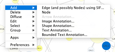 Cytoscape 具有编辑功能,你可以在网络画布中交互地构建和修改网络。要编辑网络,只需右键单击网络窗口的开放空间,选择菜单项 Add -> Node,添加一个新的节点到画布中。要添加边,需要右键单击节点,然后选择菜单项 Edit -> Add Edge。然后选择目标节点,这将在两个节点之间添加新的边。以类似的方式可以添加注释、图片、形状或文本框,就像在 MS PowerPoint 或类似软件中一样。有关网络编辑的详细信息,请参见编辑网络部分。