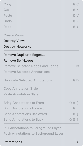 还有用于创建和销毁视图(网络的图形表示)和网络(尚未可视化的原始网络数据)的选项,以及用于从当前网络删除所选节点和边的选项。通过 Edit -> Undo 可以将所有已删除的节点和边进行恢复。