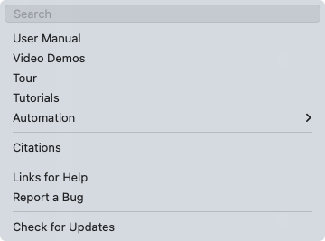 使用帮助菜单可以启动联机帮助查看器,浏览和搜索用户手册。它还提供对 Tour of Cytoscape 的直接访问,以及 Cytoscape 教程的完整列表。教程内容将在 Cytoscape 网页浏览器中自动打开。视频演示也可以通过帮助菜单链接直接访问。