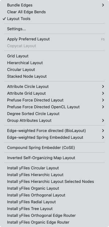 布局菜单具有用于直观组织网络的一系列功能。菜单顶部的 Bundle Edges,Clear All Edge Bends 和 Node Layout Tools 是用于操纵网络可视化的工具。菜单的底部列出了各种布局算法,这些算法可以自动布局网络。