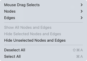Show Grid会将所有已加载的网络排列为网格。Show Network将显示当前选择的网络。Detach View将网络视图窗口与 Cytoscape 主窗口分离。Export to File...提供了导出网络或图像的选项。Always Show Graphics Details将强制渲染图形细节。默认情况下是关闭的。Toggle Node Selection允许你关闭/打开节点选择。默认情况下是开启的。Toggle Edge Selection允许你关闭/打开边选择。默认情况下是开启的。Toggle Annotation Selection允许你关闭/打开注释选择。默认情况下是关闭的。Toggle Label Selection允许你关闭/打开节点/边标签选择。默认情况下是关闭的。Hide Navigator可以隐藏导航器(鸟瞰视图)。