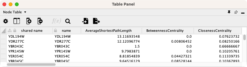 来取消停放任何面板。这在当你想为网络面板分配尽可能多的屏幕空间时很有用。现在有两个 Cytoscape 窗口,一个主窗口和一个标题为 Table Panel 的新窗口,类似于下面。当你将鼠标指针放在单元格上时,将显示一个弹出指示。