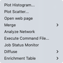 工具菜单包含了 Enrichment Table,cyChart,Analyze Network,Open web page,Merge,Execute Command File...,Job Status Monitor 和 Diffuse 等高级功能。
