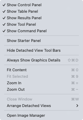 视图菜单可以显示或隐藏面板,包括 Control 面板,Table 面板,Result 面板,Tool 面板和 Command 面板。此外,它还提供了一种查看 Starter 面板的方法。它还提供对其他与视图相关功能的控制。
